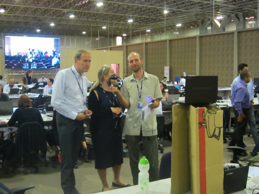 Rio-Centro hvor forhandlingerne foregår ligger 36km uden for Rios bymidte. En dag pakker vi hele L..... og tager derud i en pickup. Vi ser meget nonchalante ud da vi går forbi vagterne og stiller hele pivtøjet op og nyder 45 minutter hvor alle konference-deltagerne må passere projektet. Men ak nemesis. Successen er for stor og de interesserede menneskemasser blokerer for trafikken og FN-marshall et-eller-andet begynder at undre sig. Vi ryger over på den anden side af vejen hvor vi står resten af dagen hvilket absolut heller ikke er tosset. Jeg ved at vi har gjort noget rigtigt da FN manden sidst på dagen kommer hen og prøver at krejle sig til info om hvordan vi dog er kommet ind og gennem hvilken indgang, så han kan forhindre andre i at forstyrre jakkesættene (som i øvrigt alle som en er glade for vores projekt).