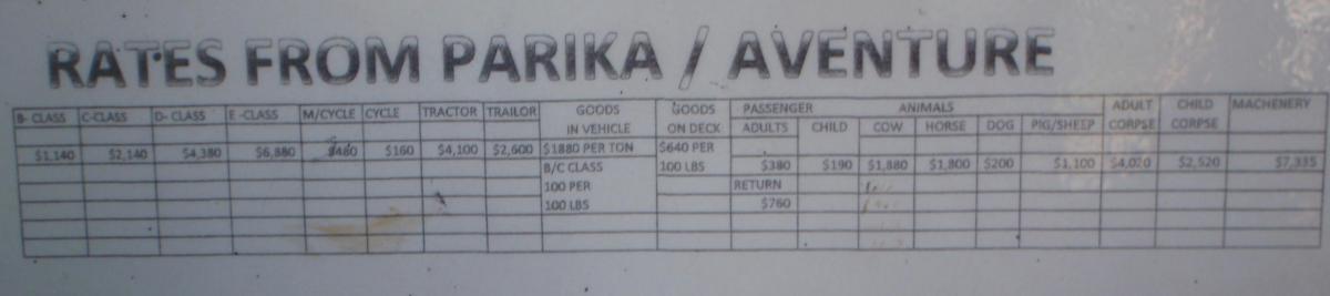 Alt foregår ad flodvejen. Fandt en ret syret prisliste over hvad ting koster at tage med på færgen. Alt fra forskellige dyr til hhv voksen- og børnelig! (kategori 2 og 3 fra højre).