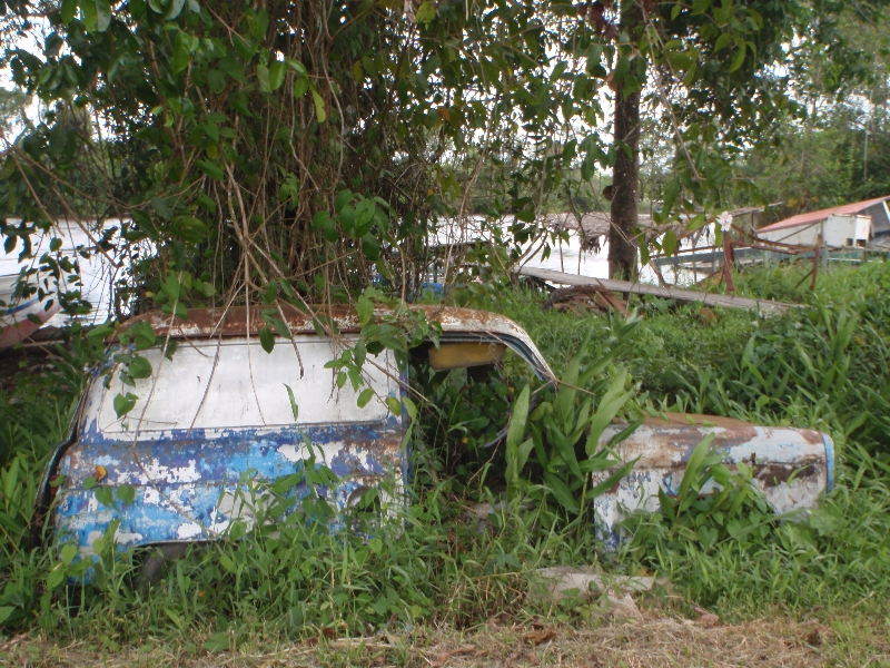 Livet hos Mark er går dog ikke kun med at drive den af. En træbåd kræver en del pleje og det er meget rart at lave noget fysisk arbejde der giver mening. Så vi pudser, maler og sliber lidt på båden. Men det meste tid bruger vi dog på tidevandet. Stedet ligger som sagt ud til en stor flod og tidevandet stiger og falder op til 2½ meter 2 gange dagligt. Floden kommer sydfra hvor regnskovens træer og grene bliver taget af strømmen, tillige med drivtømmer og alskens affald som de g-ode Surinamere kaster i floden. Og da vi bor ved en krumning vikler det sig ind i molen og ridster bådens underside. Plus at det ser ud ad h..... til når alt fra china-boxes til køleskabe ligger og flyder rundt i den ellers idyliske flod.