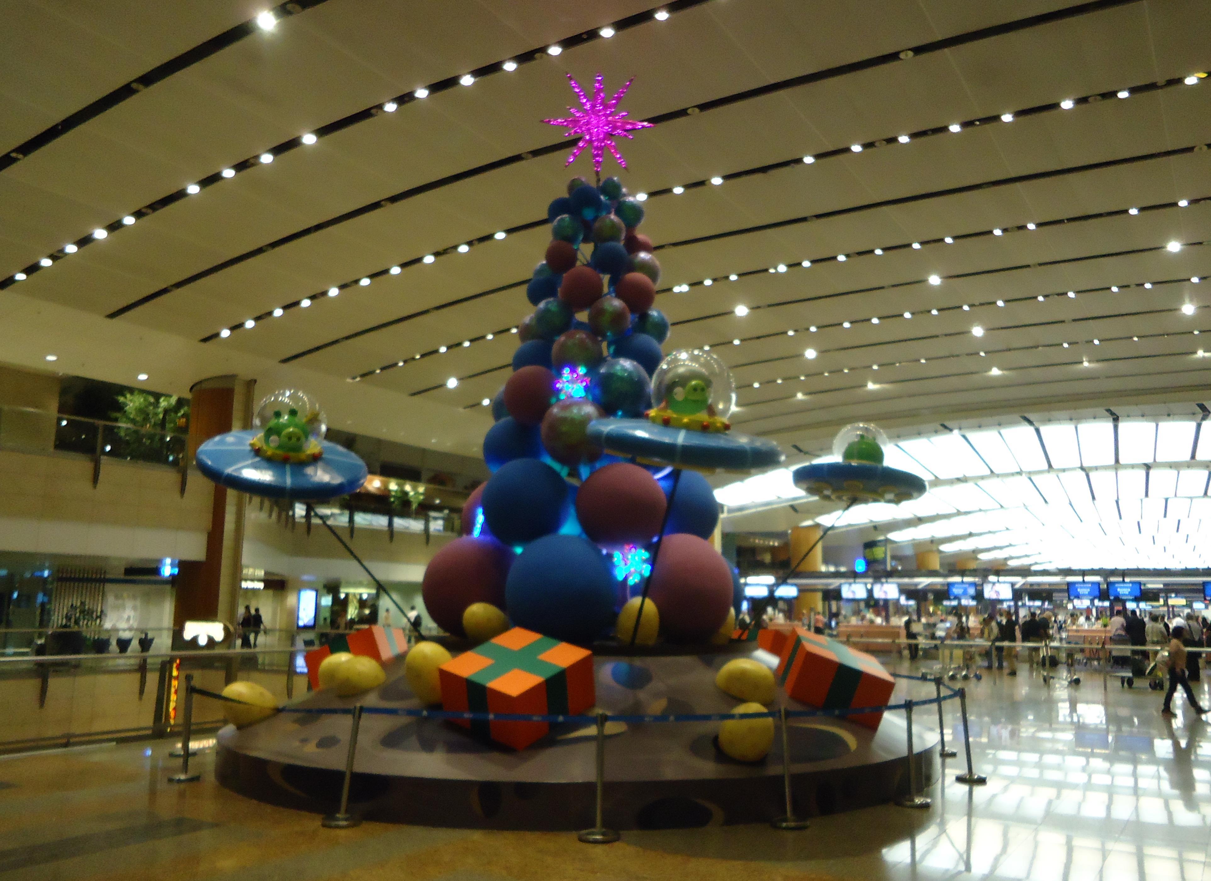 Det lykkes til sidst at lande i Singapore lufthavn kl. 5 om morgenen. Og min begejstring er ….. da jeg går igennem julejingle på julejingle og må krydse en 15 meter høj juletræsskulptur af plastik med kæmpe grønne 'angry spacebirds'-grise i rumfartøjer som dekoration inden jeg overhovedet når ud af lufthavnen.