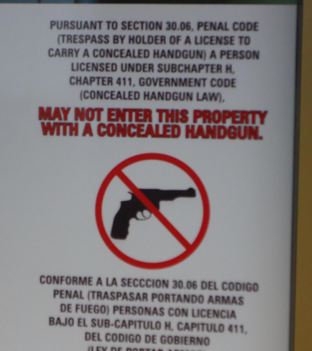 Wellcome to USA , hvor man både kan have tilladelse til at bære våben og den udvidede tilladelse til at bære skjulte våben (for de ekstra ansvarsfulde borgerer - den får man kun hvis man aldrig har deltaget i en skolemassakre). Men de skal altså være synlige hvis du vil ind på denne bar i El Paso, Texas.
