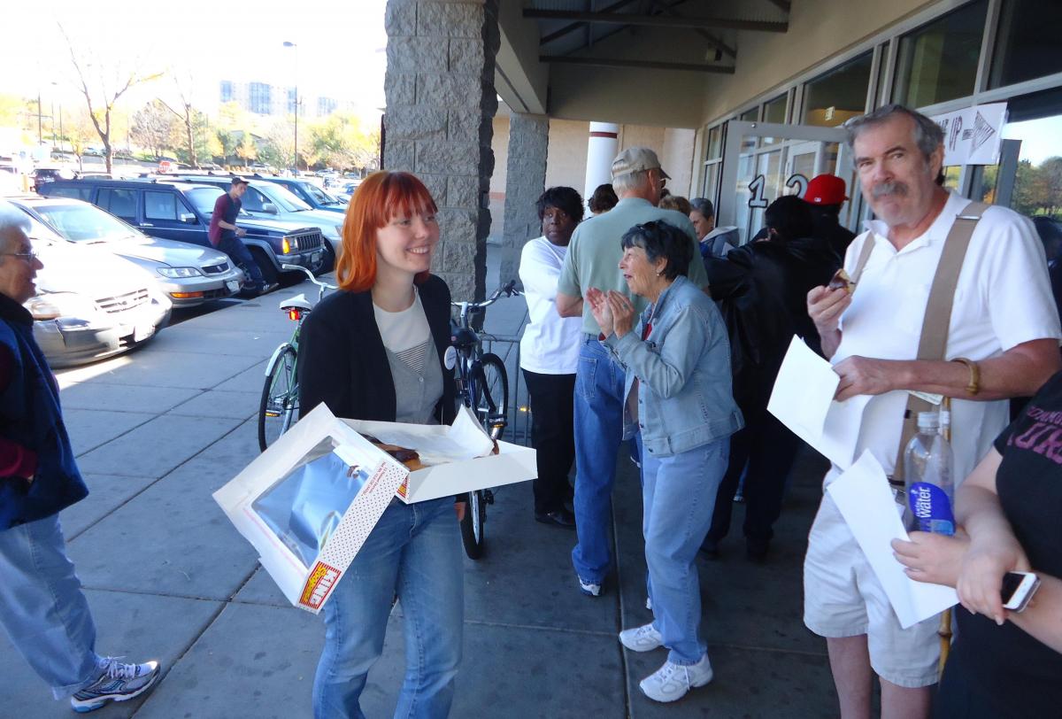 Herover - Kø til at komme og høre Obama tale. Vi skriver folk op (og tvinger dem til at tage en frivillig tørn). Men også med det søde. Mette deler donuts ud til de ventende.