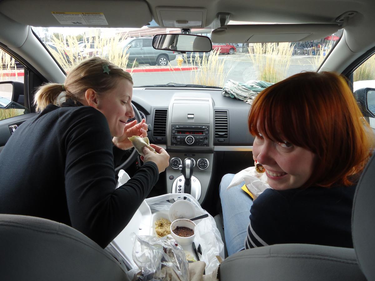 På vej mod Rocky mountains i syrebillig lejet bil. Og ... om tøserne så ikke synes det vigtigste er at købe Mexi-food og æde det i bilen... (jeg er i kæmpe undertal på hele turen)
